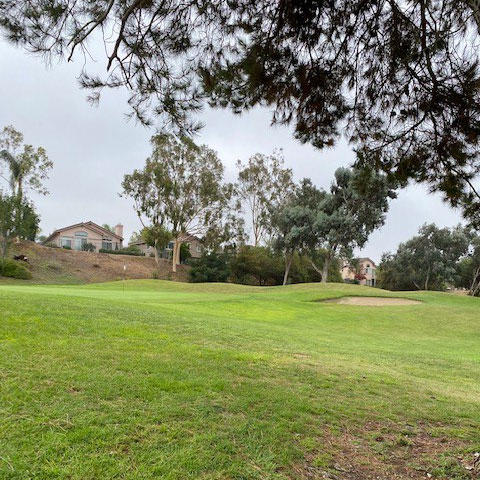 I was about 26 yards from the pin and hit a good sand wedge. Why was it good? Because it was on the green, leaving me 5 yards out. I just missed the 5 yard putt and was in for a double bogey — a net bogey for me.