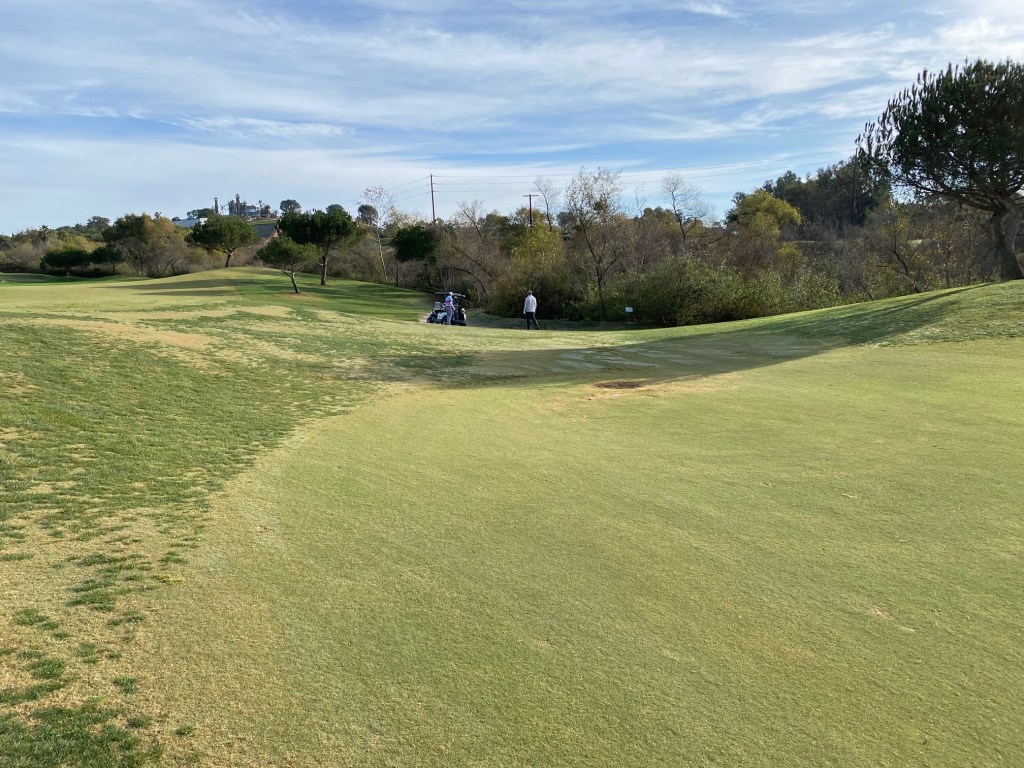 Hole 4 I hit a 7 iron off the tee directly into the grass bunker through the first cut of fairway. Both my playing partners hit the bunker that collects balls sliding out of the fairway to the right. Here they are looking for their balls.