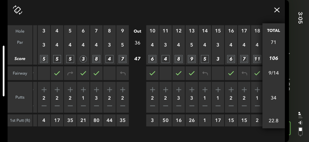 Putted well, considering the green speed. This was also a round that featured a 20 minute wait to get to the tee box on hole 3. But I did go bogey-par to start … and then the wheels fell off on hole 4 with a 9, lying 3 off the tee box.