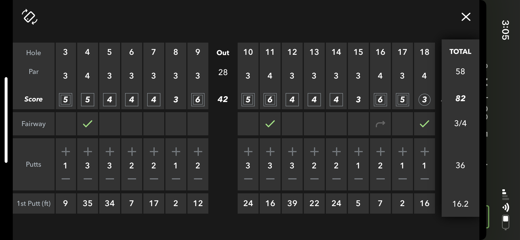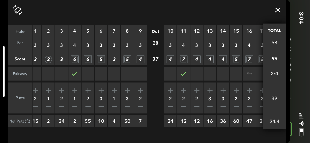 Played with the boys in the afternoon. 29% good strokes. Started par, birdie, par hitting, 3 greens. I hit 3 greens after that and shot an 86 for +28 with 39 putts.